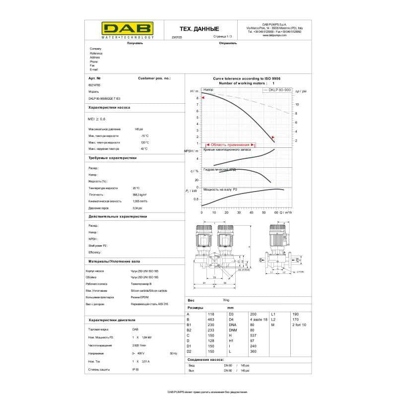 Циркуляционный насос ин-лайн DAB DKLP 80-900/BQQE T 1840 Вт H 9 м Q 976 л/мин механический (60214785)