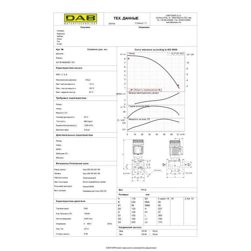 Циркуляционный насос ин-лайн DAB KLP 80-900 T 1840 Вт H 9 м Q 1178 л/мин механический (60214749)