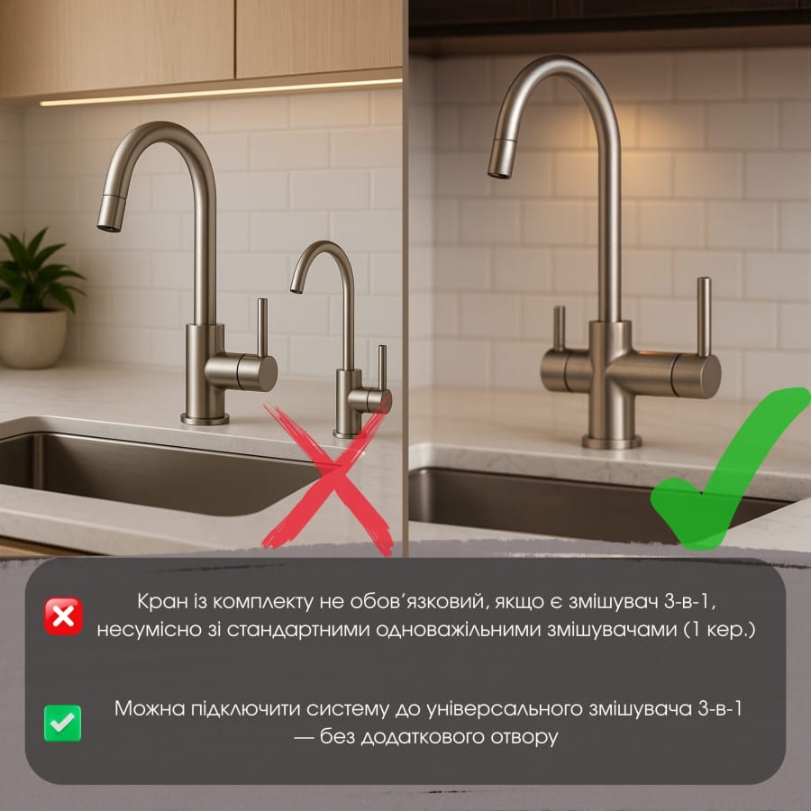 | Дополнительные характеристики | Подключение к универсальному смесителю 3-в-1 (без дополнительного отверстия) |