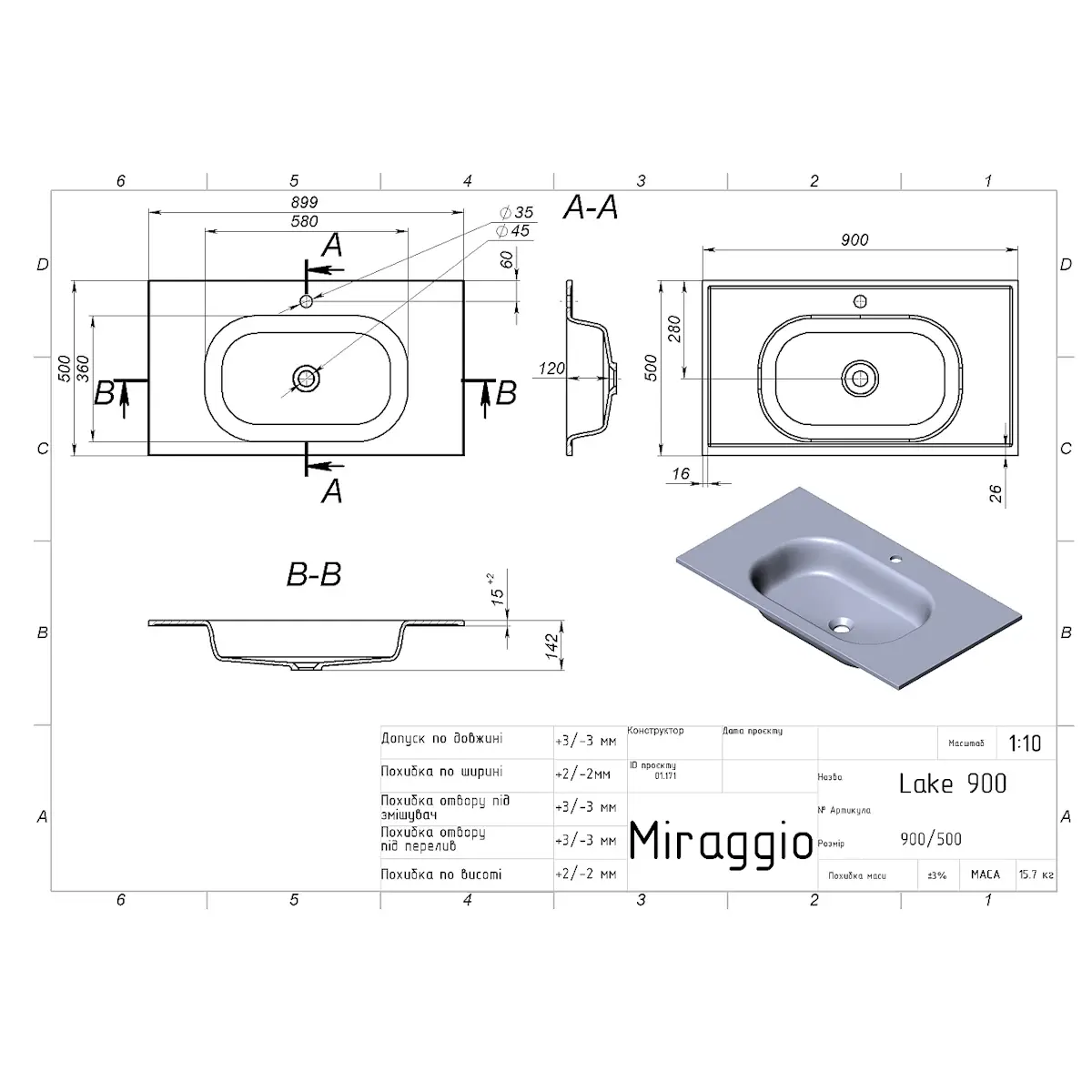 Умывальник накладной Miraggio Lake 900×500 прямоугольный, белый