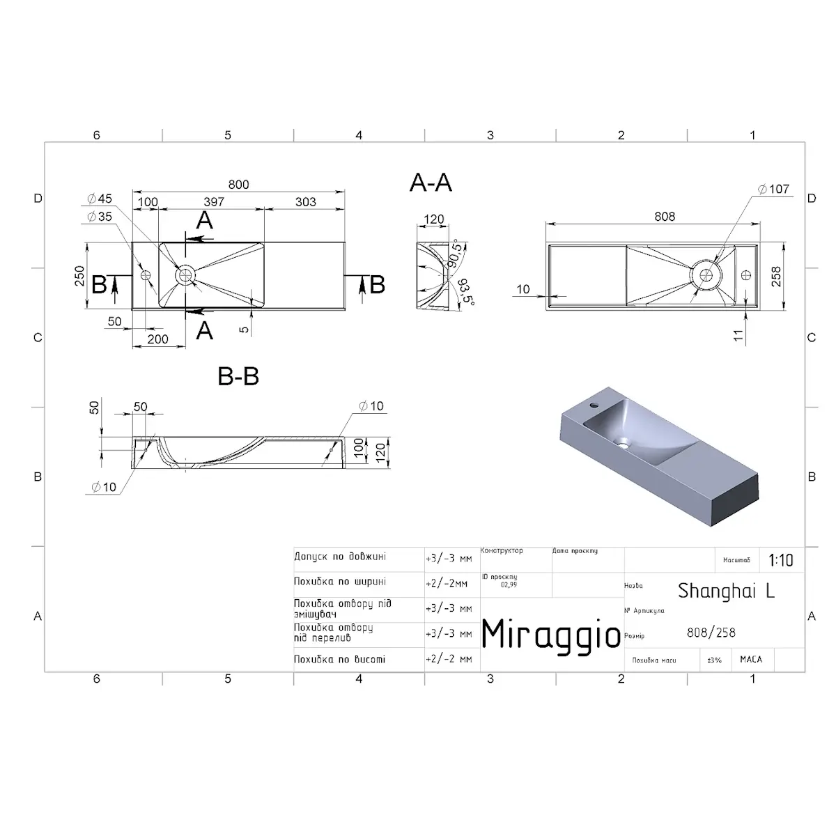 Умывальник подвесной Miraggio Shanghai 810×260 L прямоугольный, белый