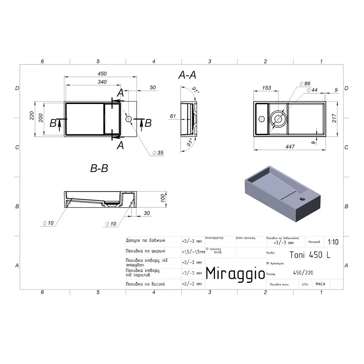 Умывальник подвесной Miraggio Toni 450×220 L прямоугольный, белый
