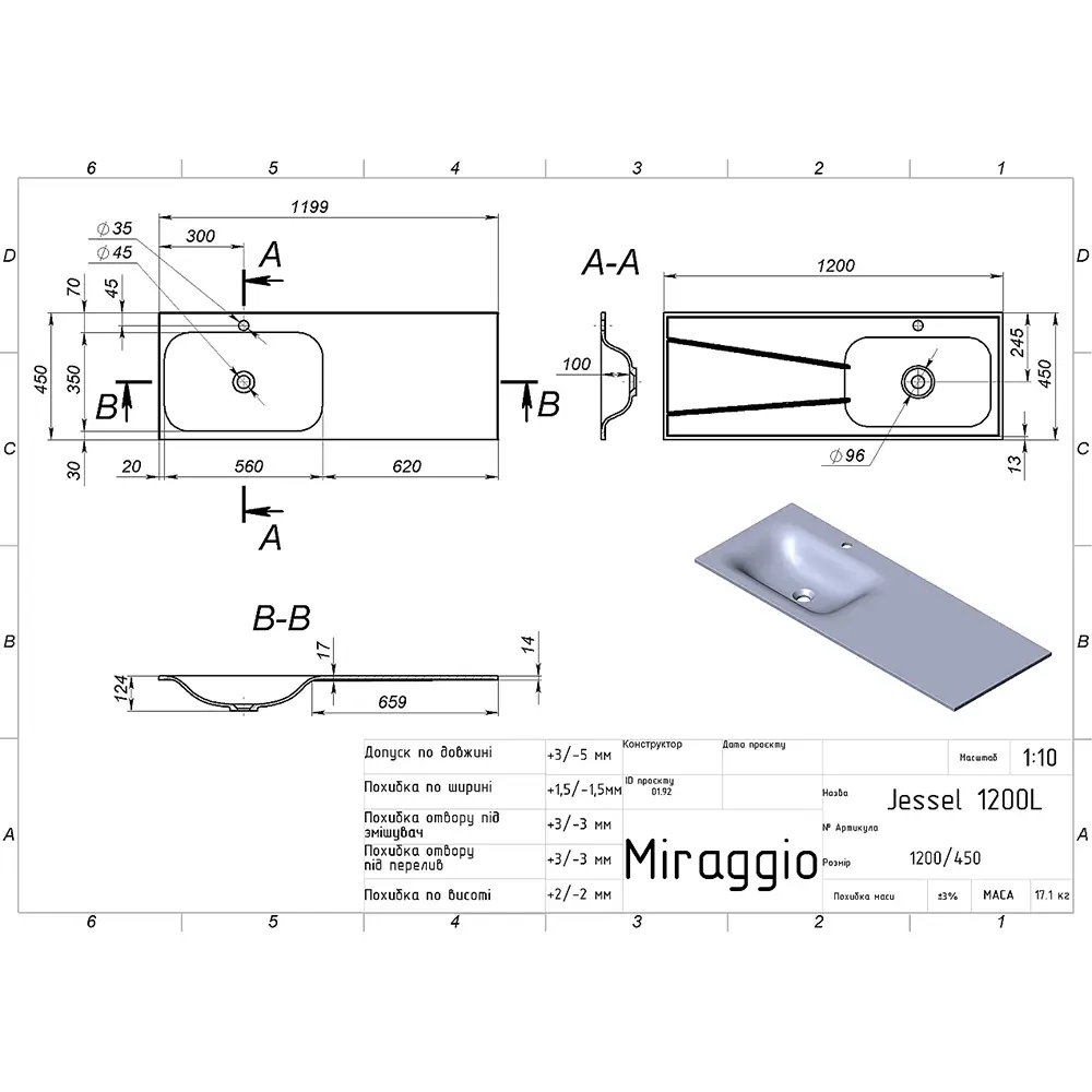 Умывальник врезной Miraggio Jessel L 1200×450 прямоугольный, белый матовый