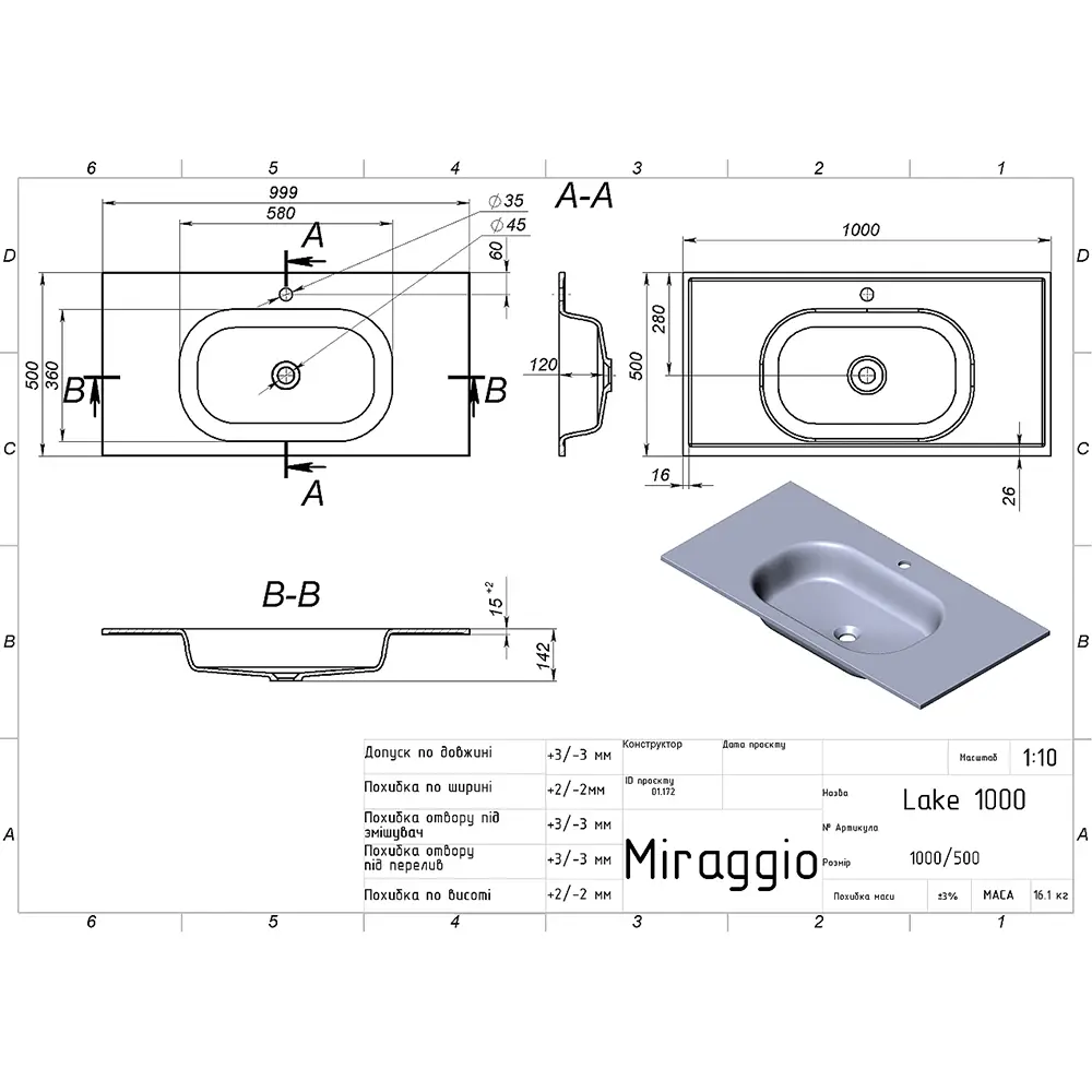 Умывальник врезной Miraggio Lake 1000×500 прямоугольный, белый