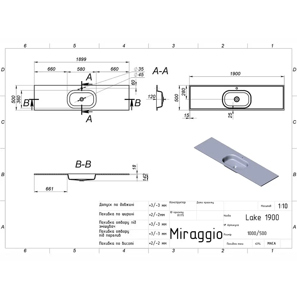Умывальник врезной Miraggio Lake 1900×500 прямоугольный, белый