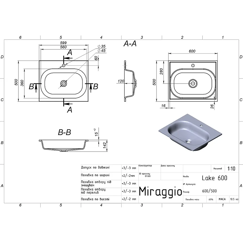 Умывальник врезной Miraggio Lake 600×500 прямоугольный, белый