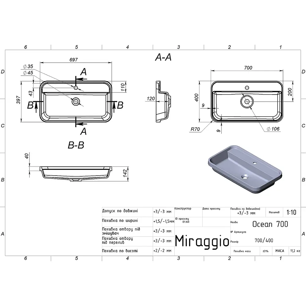 Умывальник врезной Miraggio Ocean 700×400 прямоугольный, белый