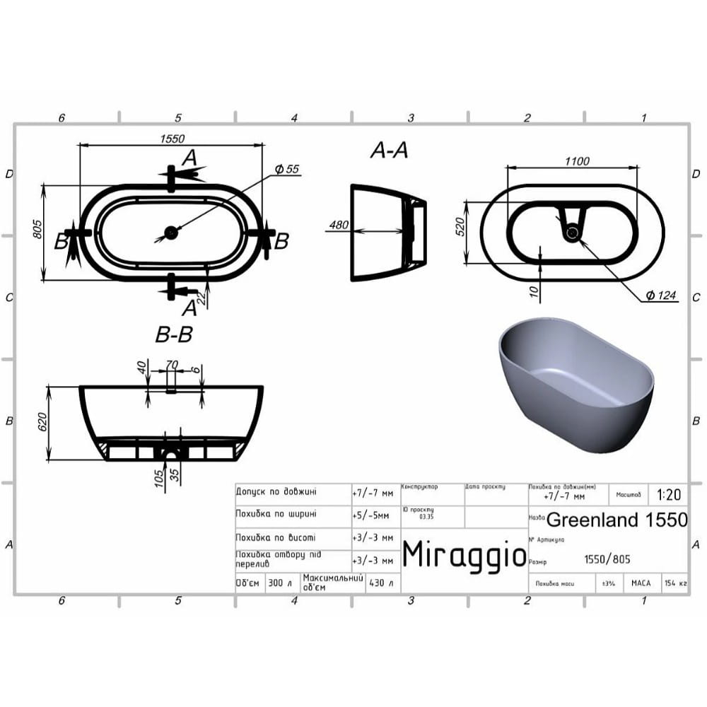 | Высота ванны, мм | 620 |