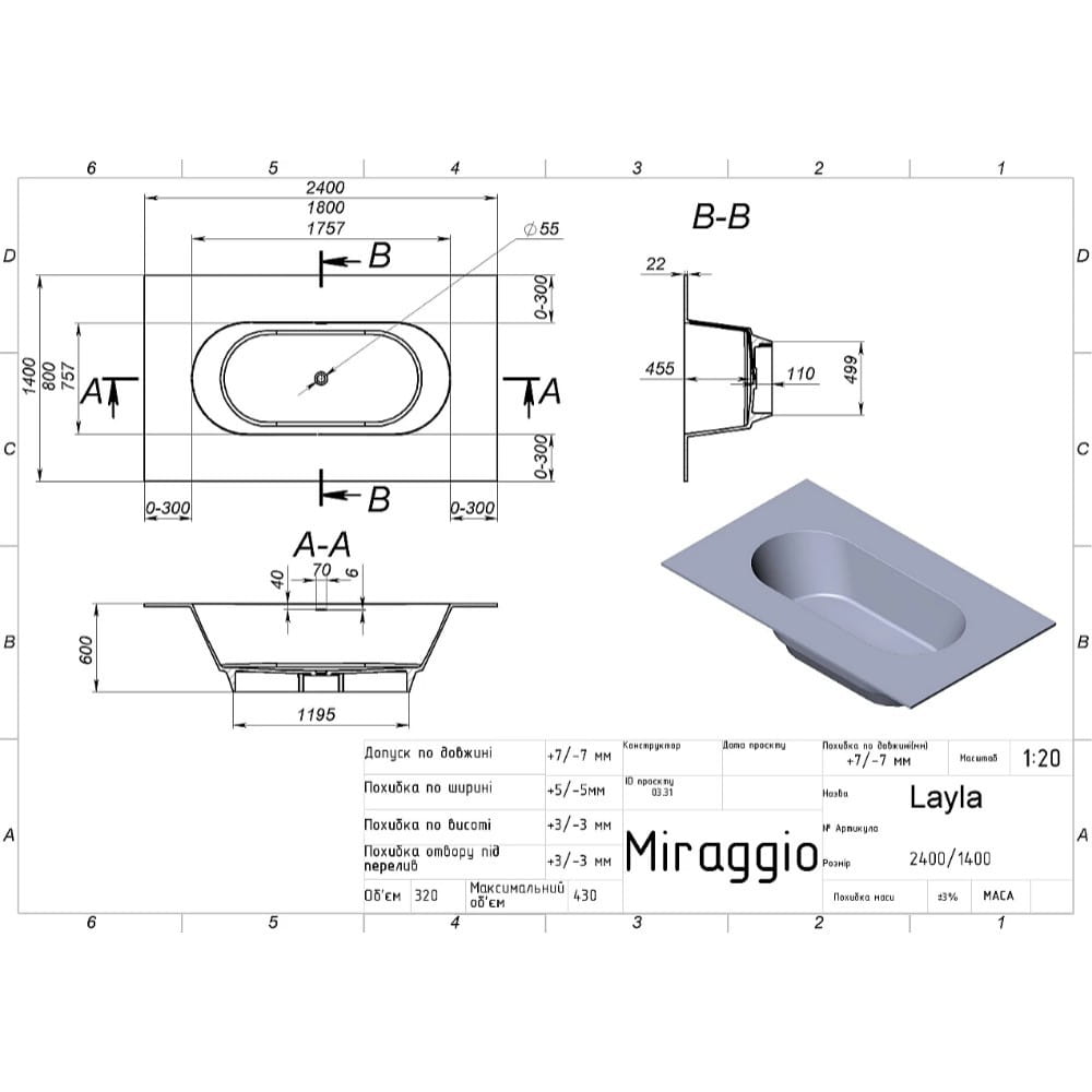 Ванна акриловая Miraggio Layla 240×140 врезная, белая полуматовая (69125670)