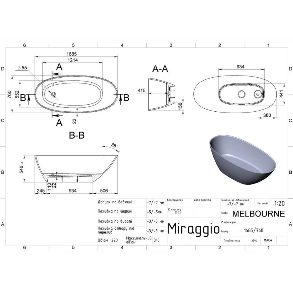 Ванна акриловая Miraggio Melbourne 168×76 овальная, белая полуматовая (0001490)