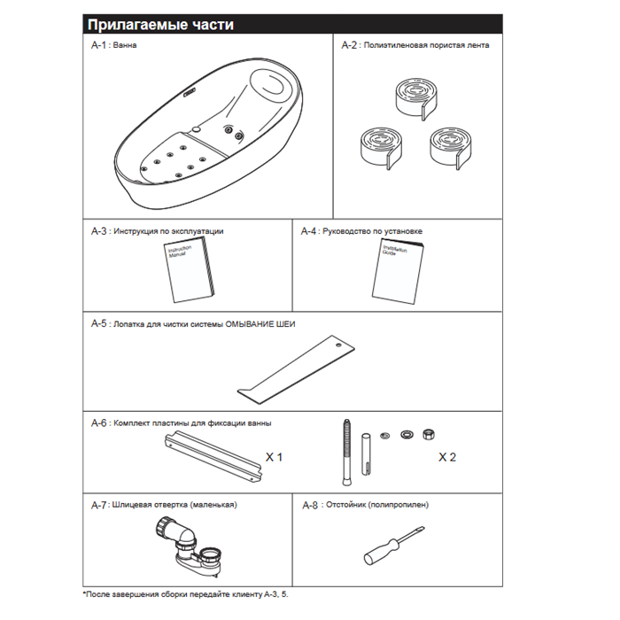 | Комплектация | Арматура слив-перелива, Ванна, Ножки, Сифон, Инструкция по эксплуатации, Комплект пластины для фиксации ванны, Лопатка для чистки системы ОМЫВАНИЕ ШЕИ, Нажимная сливная пробка, Нижняя подсветка, Отстойник (полипропилен), Подголовник, Полиэтиленовая пористая лента, Регулируемый подголовник, Руководство по установке, Светодиодная подсветка, Сенсорная панель электростатического емкостного типа, Шлицевая отвертка (маленькая), Щелевой слив |
