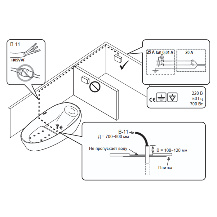 | Дополнительные характеристики | Автоматический слив включается приблизительно через 5 минут после слива воды из ванны, Автоматическое отключение – через 15 мин, Для работы функций Neck Bath и Hydrohands вода должна быть минимум на 14 см выше секции поддержки ног и на 26 см выше нижней секции, Класс защиты – IPX5, Количество водовыпусков ОМЫВАНИЕ ШЕИ – 1 место, Количество водовыпусков РУЧНОЙ ГИДРОМАССАЖ – 2 место, Количество впускных частей ОМЫВАНИЕ ШЕИ – 1 место, Количество впускных частей РУЧНОЙ ГИДРОМАССАЖ – 1 место, Количество отверстий для струй – 8 мест, Максимальная температура воды не должна превышать 60°C, чтобы не повредить композитную поверхность, Метод слива: Нормальный слив (полуавтоматический слив с электромагнитным клапаном) + Слив при переполнении, Номинальная частота – 50 Гц, Номинальное напряжение – 220 В пер.тока, Номинальное потребление электроэнергии – 700 Вт, Номинальное потребление электроэнергии (Светодиод) – 45 Вт, Объем выводимого воздуха: Прибл. 400 л/мин (Сильный режим), Прибл. 250 л/мин (Слабый режим), Осветительная часть Светодиодной подсветки – 1 место, Потребление электроэнергии в режиме ожидания – 2,8 Вт, Расход при спуске воды ОМЫВАНИЕ ШЕИ – Прибл. 18 л/мин, Расход при спуске воды РУЧНОЙ ГИДРОМАССАЖ – Прибл. 60 л/мин, Система HYDROHANDS, Система воздушного струя (Air-Jet), Скорость слива (установлен отстойник) – 48 л/мин, Скорость слива при переполнении (установлен отстойник) – 48 л/мин, Технология Zero Dimension, Устройство защиты от перегрузки по току, Устройство защиты от перенагрева (тепловой предохранитель), Устройство предотвращения непрерывной работы, Функция блокировки клавиш, Цвет освещения – 1 цвет |