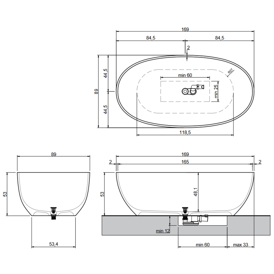 Ванна отдельностоящая Antonio Lupi Reflex Basalto 169×89 композит, базальтовая матовая (REFLEXMOOD)
