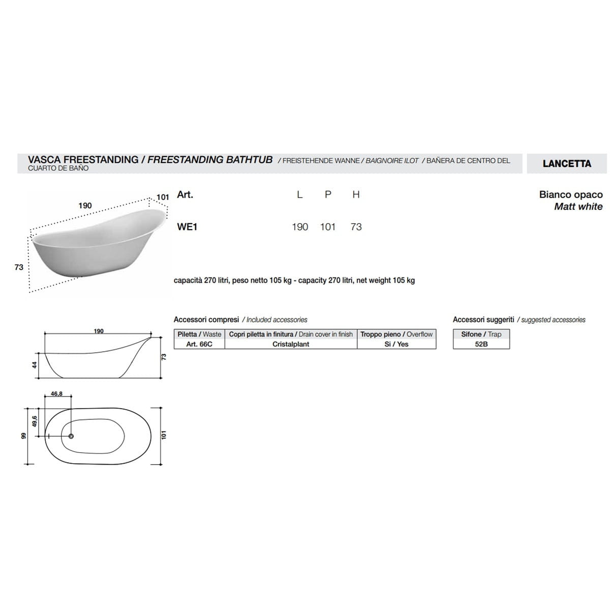 Ванна отдельностоящая Falper Lancetta 190×101 искусственный камень, белая матовая (WE1)