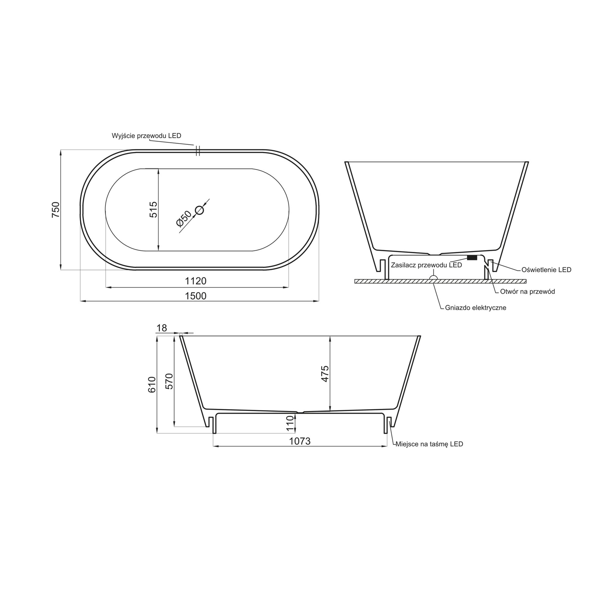 Ванна отдельностоящая Polimat IDA 150×75 искусственный камень, белая глянцевая