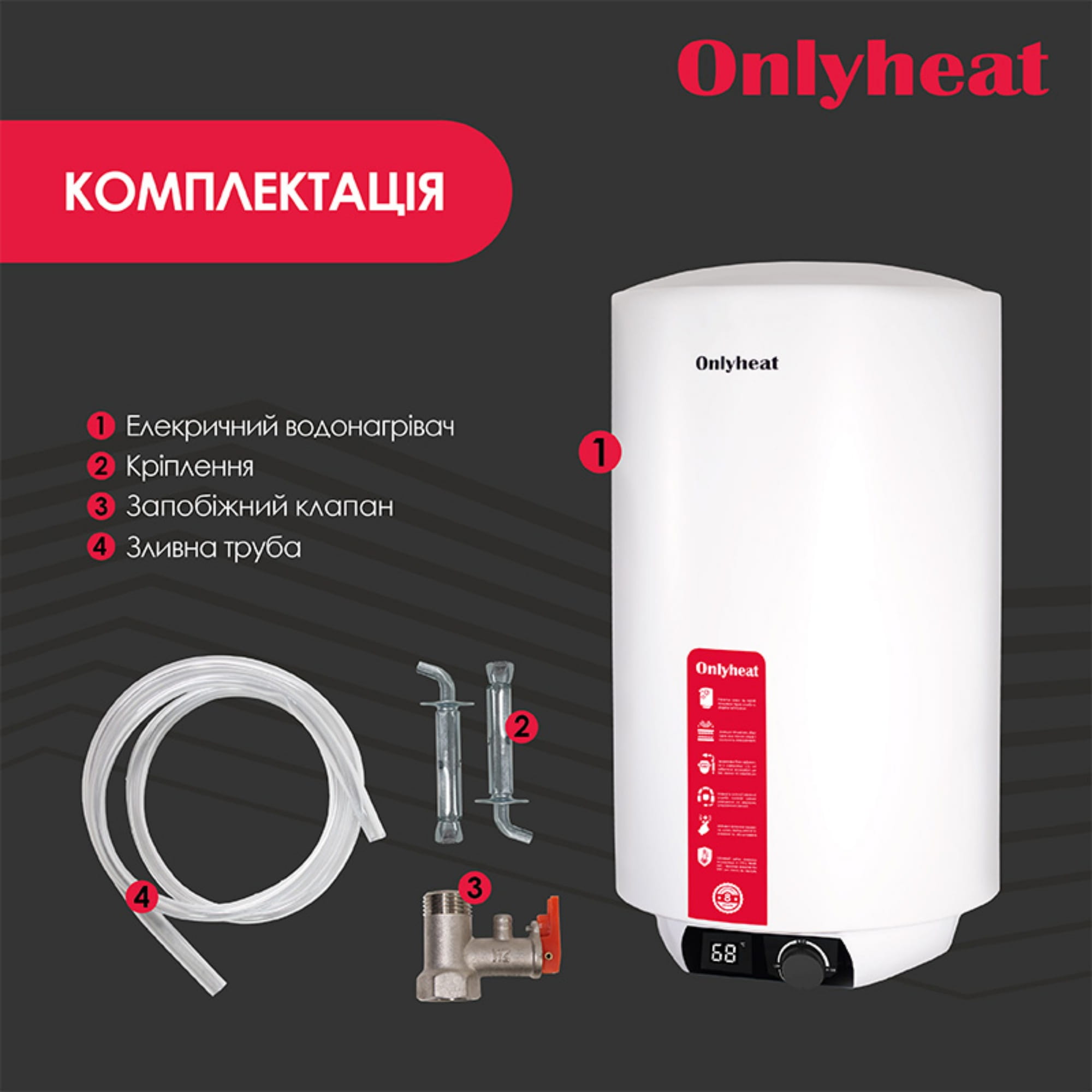 | Комплектація | Бойлер, Кабель 1,5 м, Запобіжний клапан, Кріплення, Гарантійний талон, Трубка для зливу |