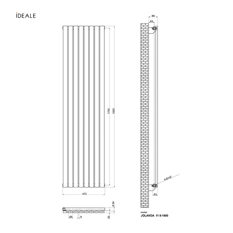 Дизайнерський радіатор IDEALE ADELE 11 1500×472 вертикальний, антрацит матовий