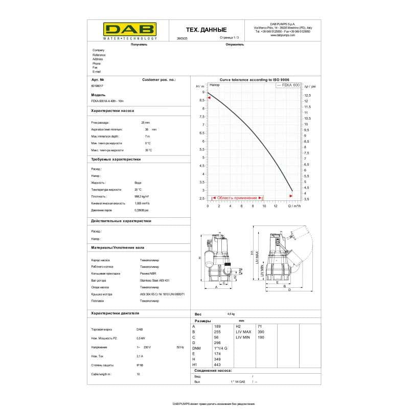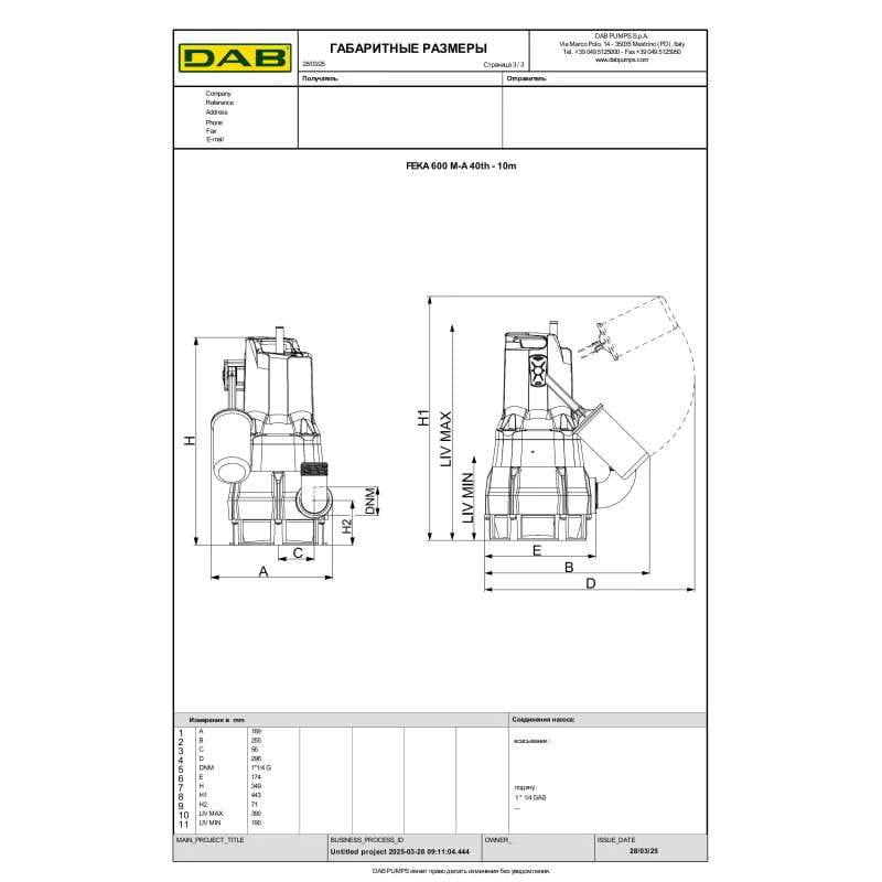 Дренажний насос DAB FEKA 600 MA 40th 10H05 0,5 кВт H 9 м Q 250 л/хв з поплавком (60198017H)