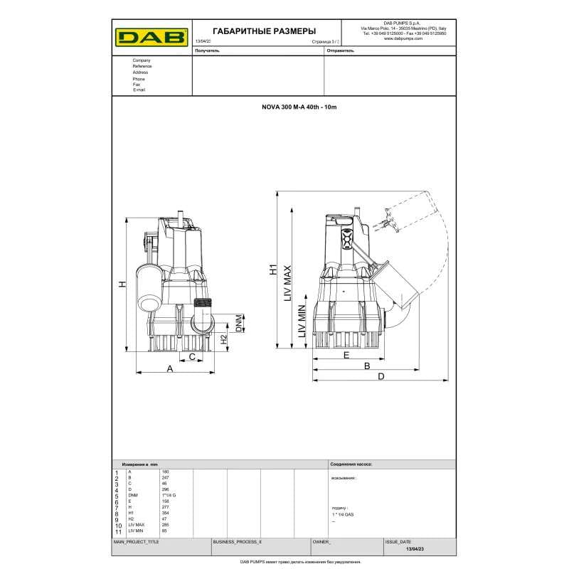 Дренажний насос DAB Nova 300 MA 40th 05H05 0,35 кВт H 7 м Q 200 л/хв з поплавком (60194400H)
