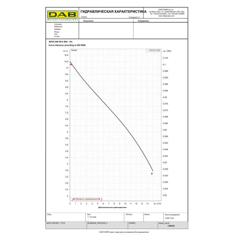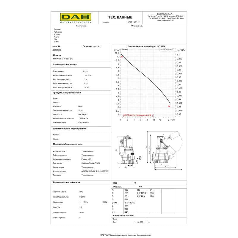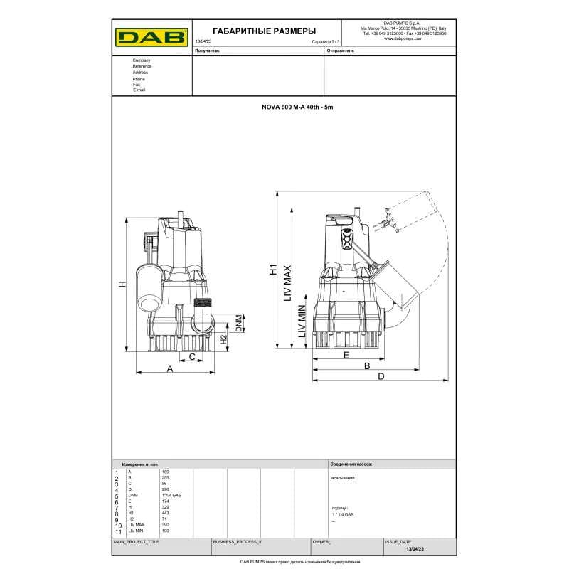 Дренажний насос DAB Nova 600 MA 40th 50H05 0,5 кВт H 10 м Q 250 л/хв з поплавком (60191566H)