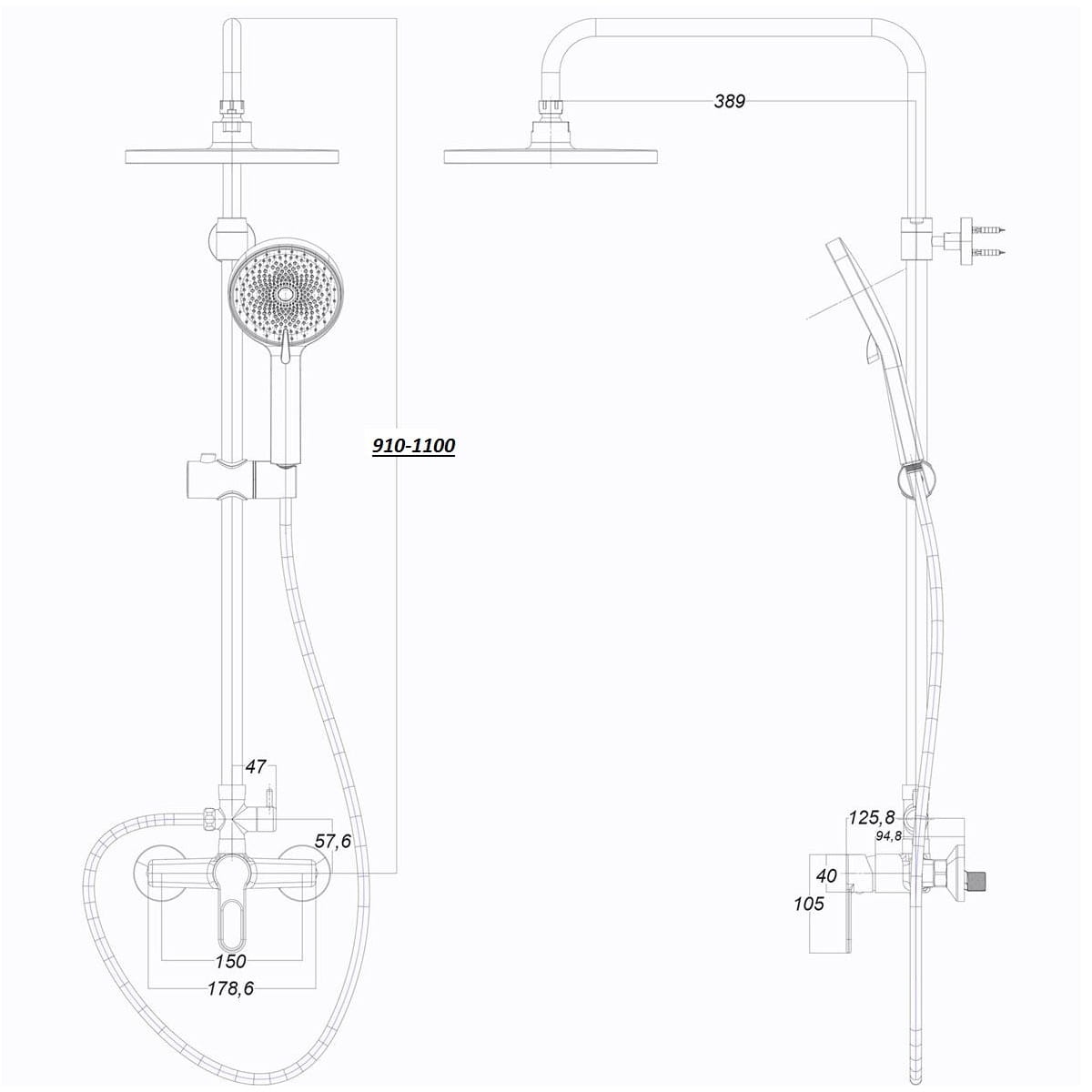 | Довжина кронштейна для верхнього душу, мм | 389 |