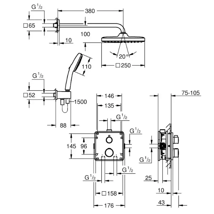 | Комплектація | Верхній душ, Лейка для ручного душу, Тримач для ручного душу, Душовий змішувач, Душовий кронштейн |