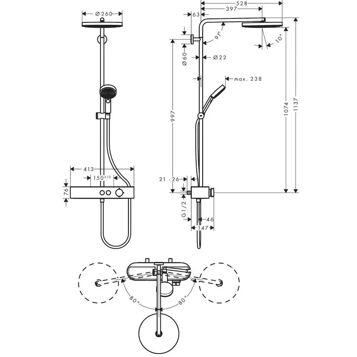 | Комплектація | Верхній душ, Душова стійка, Душовий шланг, Кронштейн для верхнього душу, Ручна лійка |