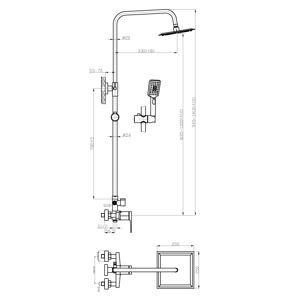 | Диаметр верхнего душа | 200х200 мм |