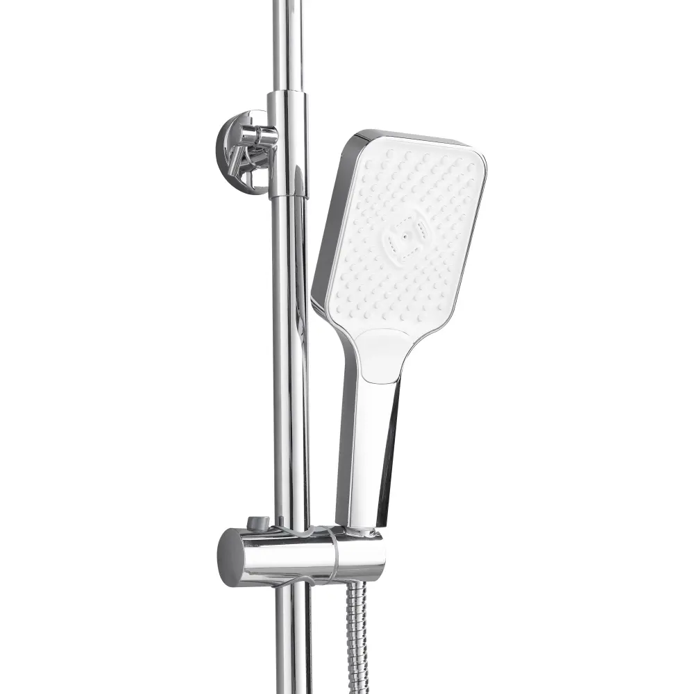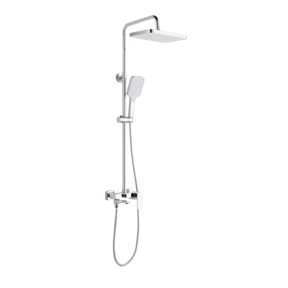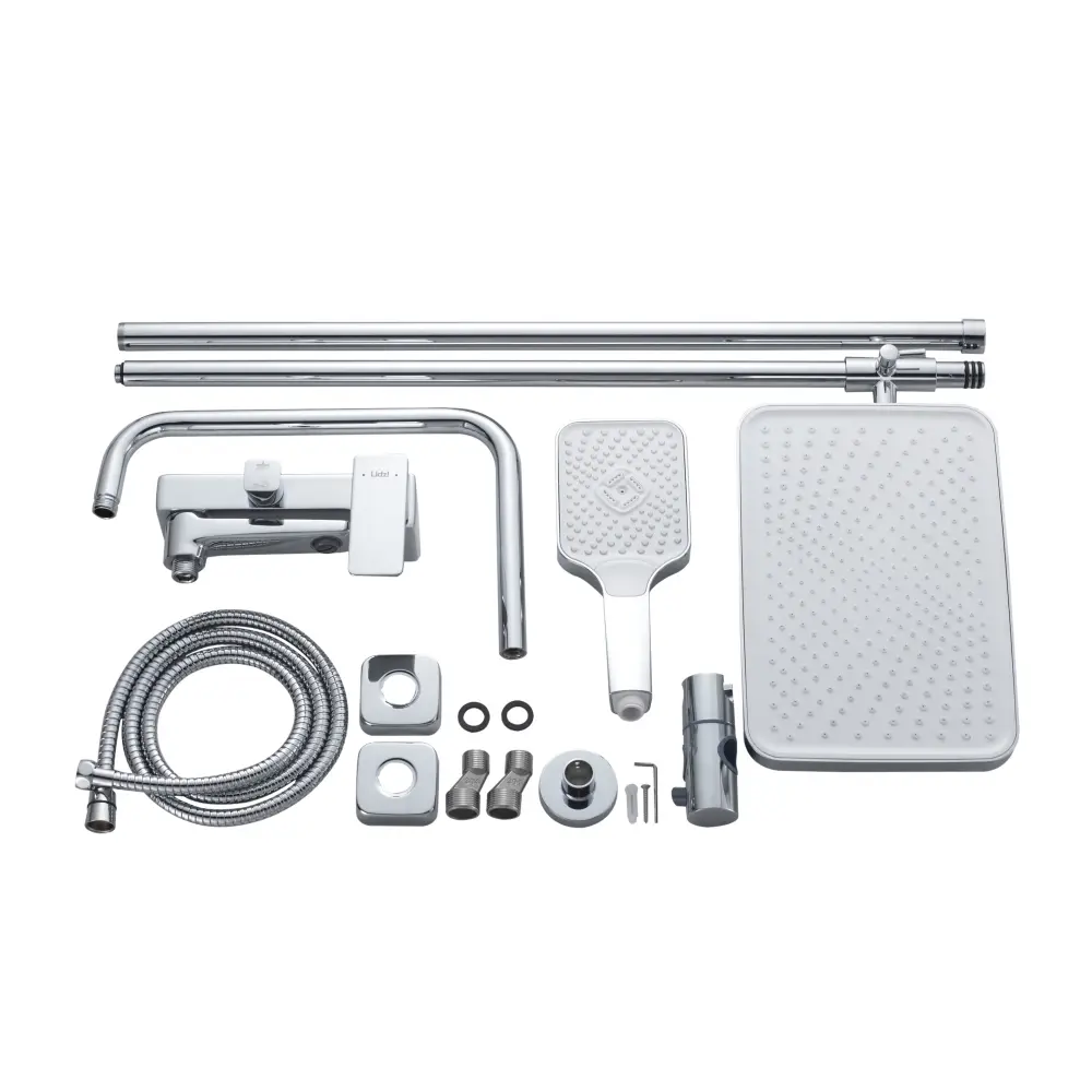| Комплектація | Душовий шланг, Змішувач, Верхня лійка, Вилив, Декоративні чашки (розетки) – 2 шт, Душова стійка – 3 секції, Ексцентрики (перехідники) – 2 шт, Кріплення для стійки, Ручна лійка, Тримач для ручної лійки, Ущільнювальні прокладки – 2 шт |