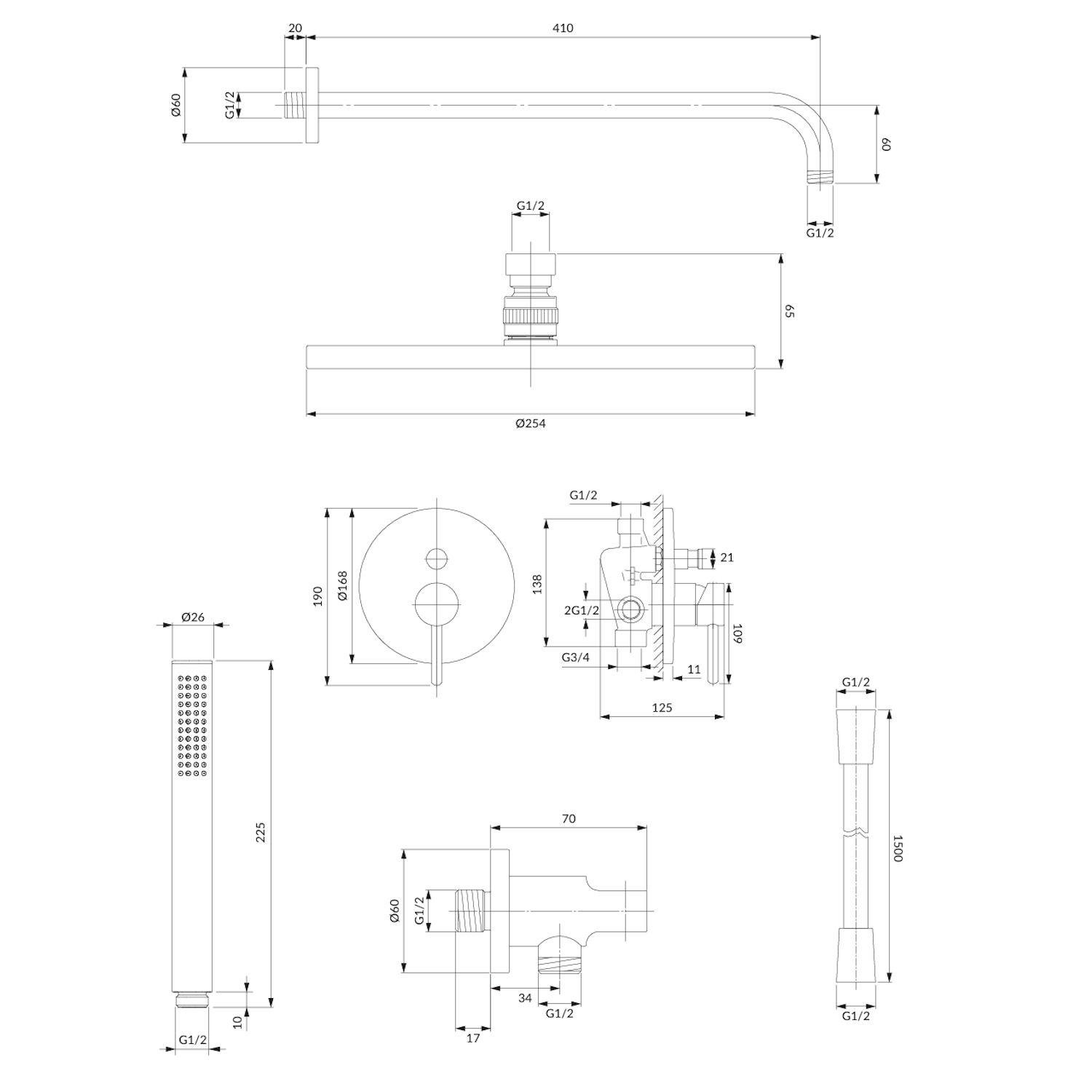 | Комплектація | Верхній душ, Душовий шланг, Змішувач прихованого монтажу, Ручний душ |