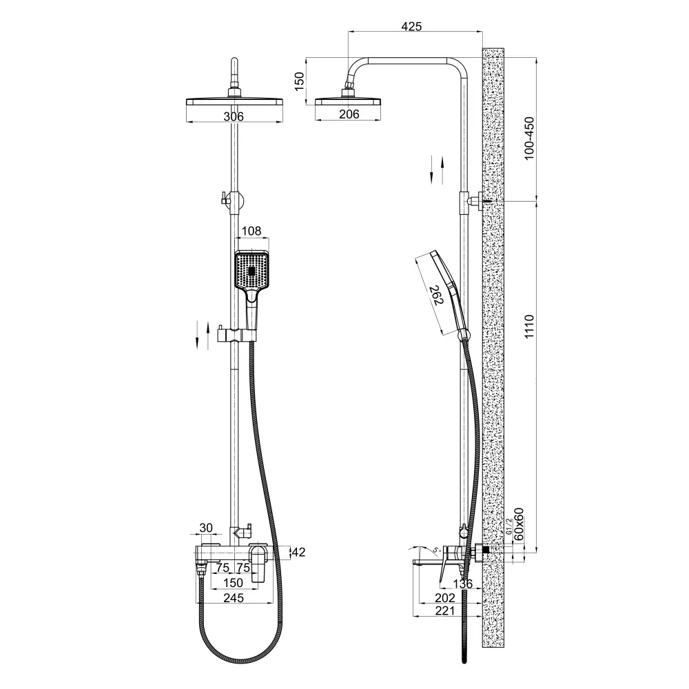 | Комплектація | Верхній душ, Душова стійка, Лейка для ручного душу, Тримач для ручного душу, Душовий змішувач, Душовий кронштейн |