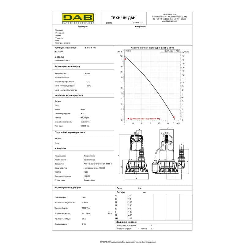 Фекальний насос DAB Feka BVP 750 M-A 0,75 кВт H 12 м Q 391 л/хв з поплавком (60122691H)