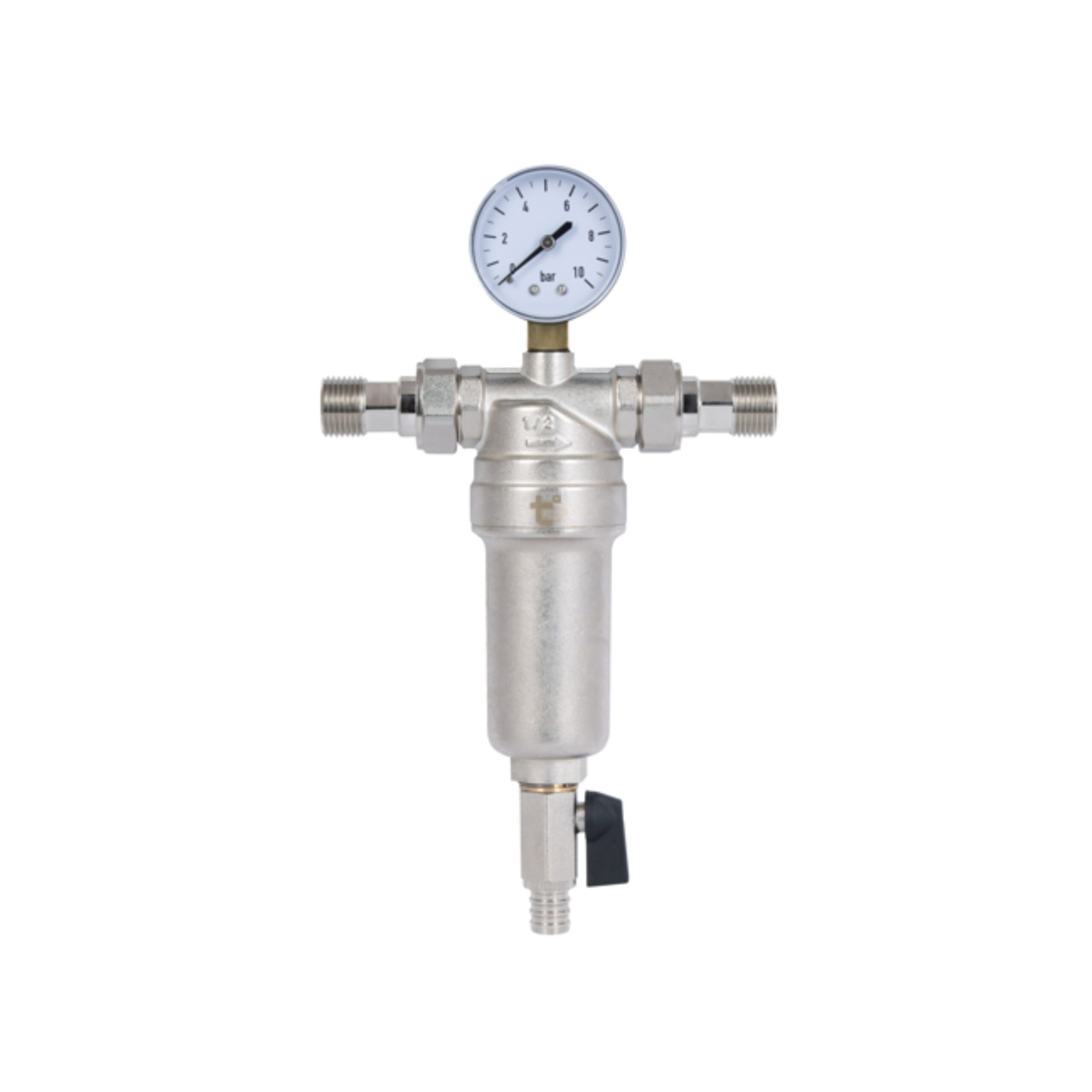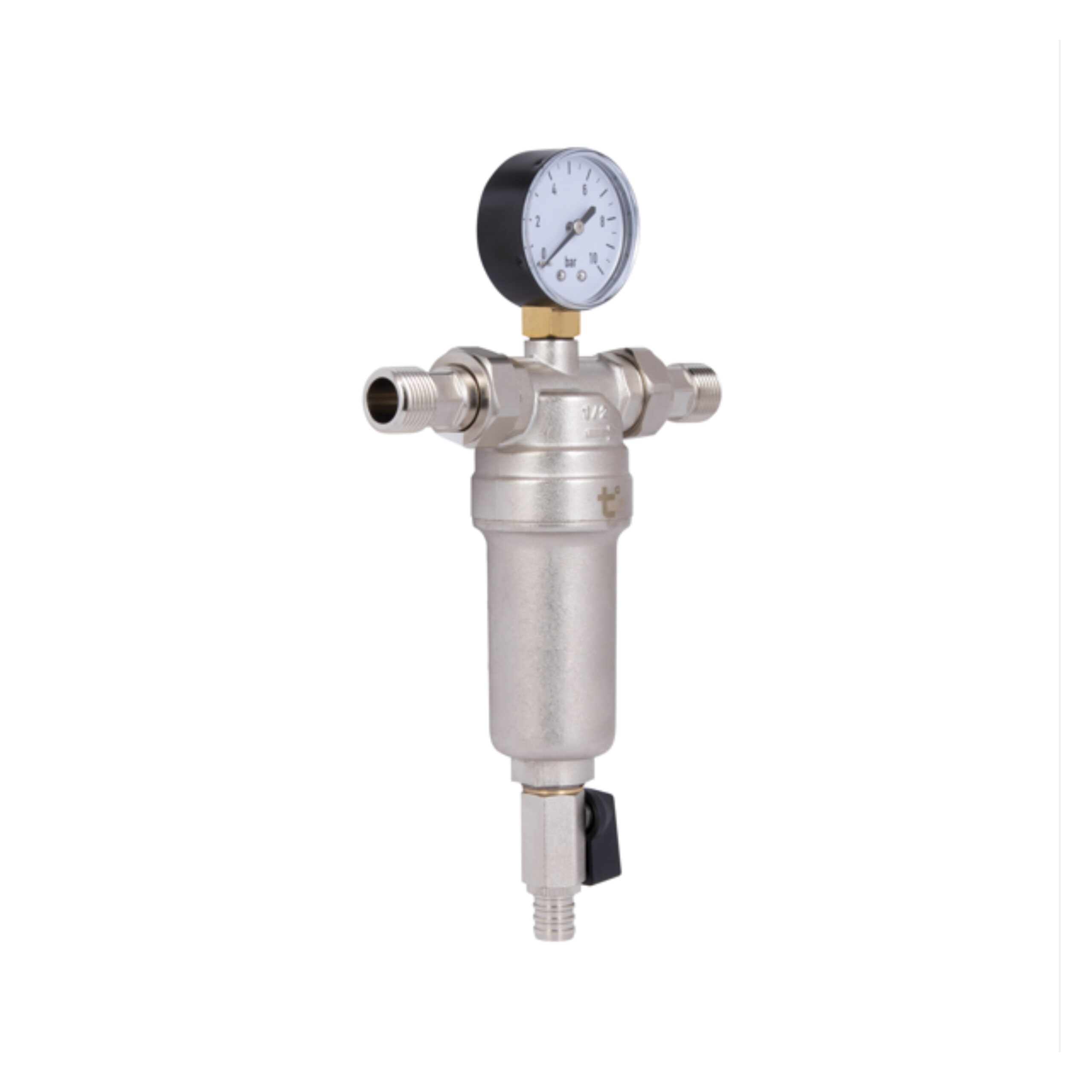 Фільтр самопромивний SD Forte 1/2″ для води виготовляється з латуні з нікельованим покриттям, йде в комплекті з манометром.