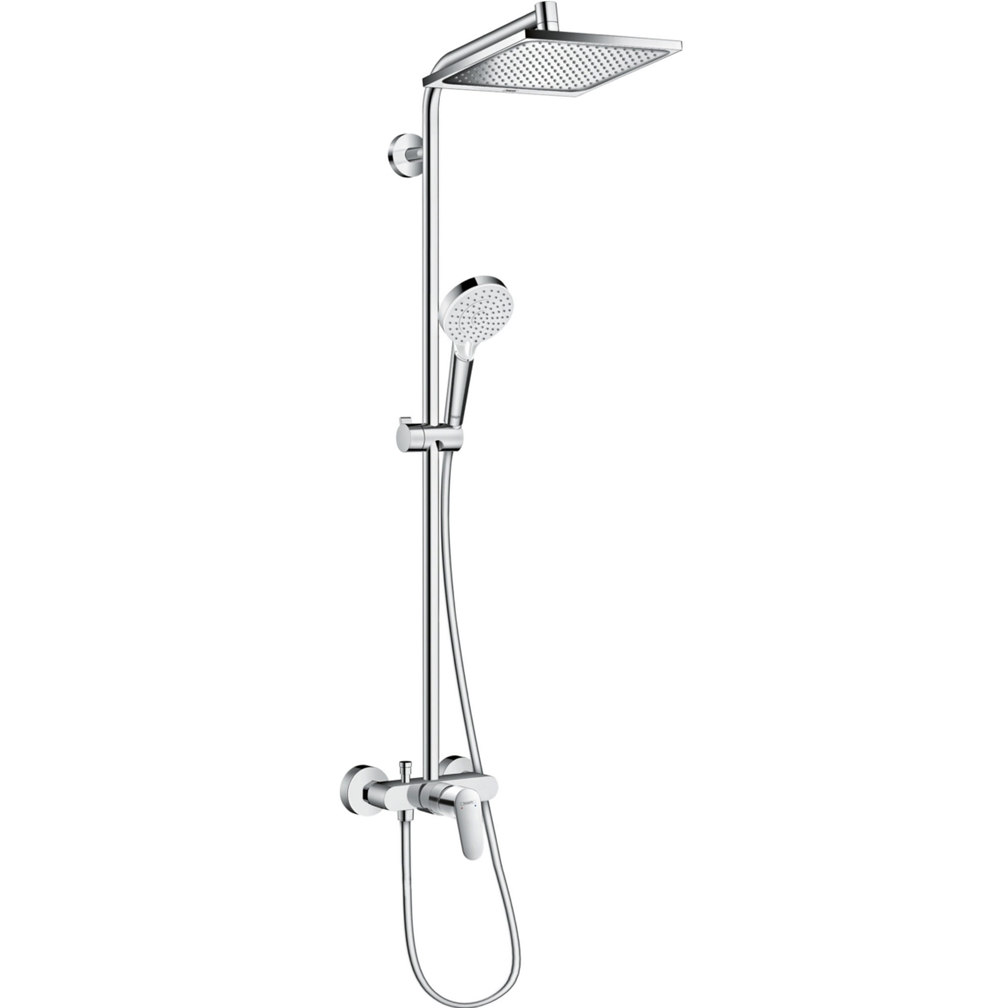 Crometta E 240 1jet Showerpipe Душова система з одноважільним змішувачем, хром. Регульований обмежувач температури гарячої води, верхній душ Crometta E 240; розмір душового диска: 240 x 240 мм; регульований кут верхнього душу; тип струменя: Rain; витрата води для струменя Rain (за умови 3 бар): 15 л/хв; повністю хромований душовий диск; довжина тримача для душу: 350 мм; регульоване за висотою кріплення ручного душу; вид монтажу: зовнішній монтаж; величина з’єднання DN15; з’єднувальне різьблення G ½; міжосьове підключення 150 мм ± 12 мм; керамічний вузол змішування; регульоване обмеження температури; клас шуму: I; клас витрати води: O, B