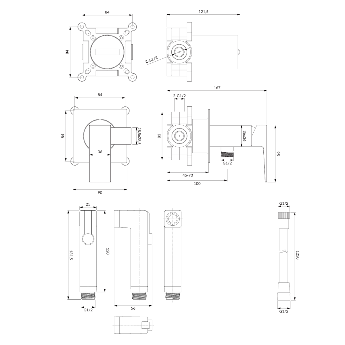 | Комплект гигиенического душа | З вбудованою частиною, З душовим шлангом, З ручною лійкою, З тримачем для душу, З шланговим підключенням |