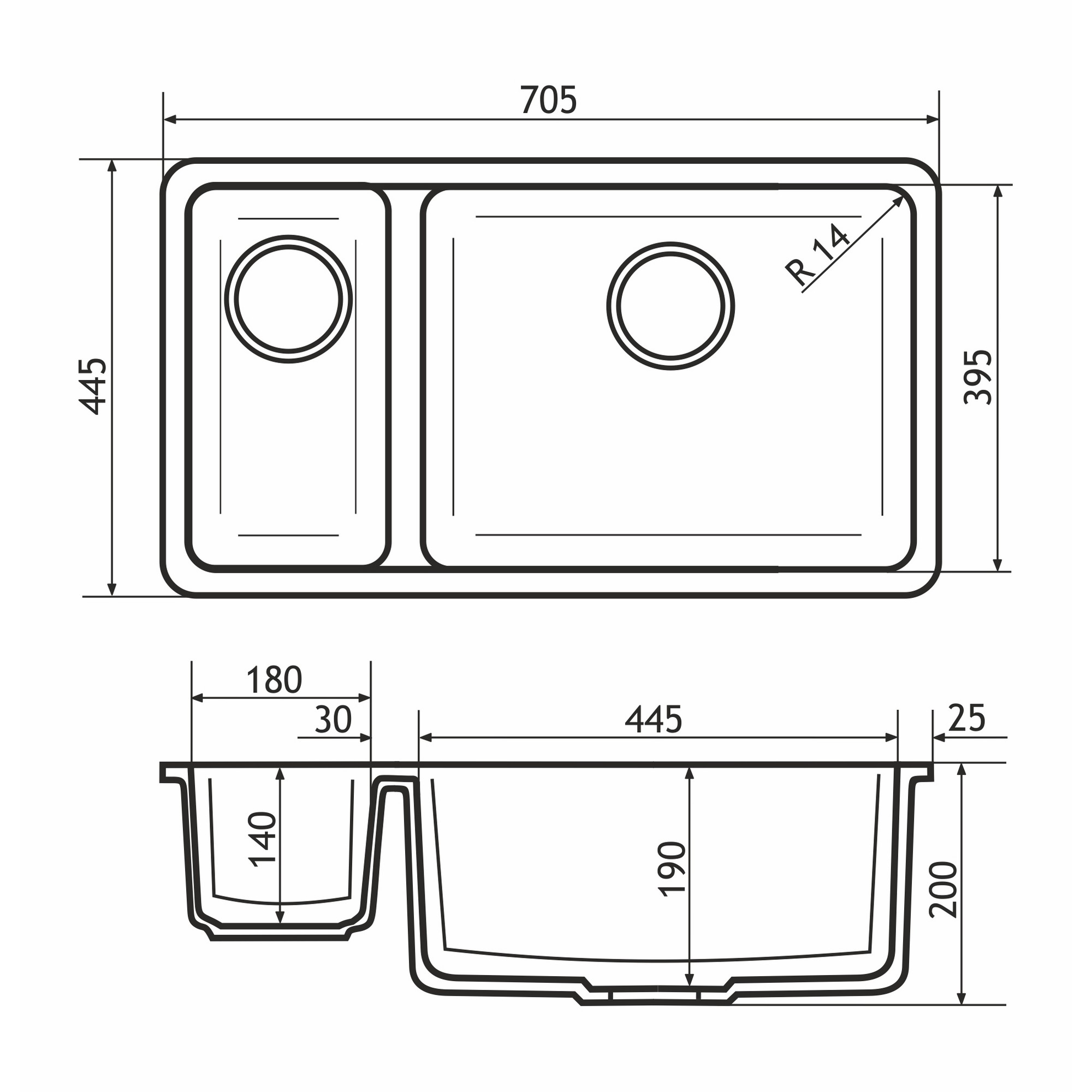 Гранітна мийка для кухні GRANADO Under top double 705×445 врізна, прямокутна, світло-сіра матова