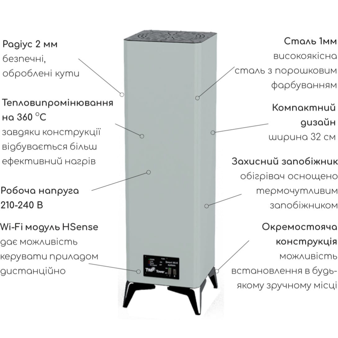 Інфрачервоний обігрівач TWP Tower 1800 Вт 34 м2 дистанційний, білий + пульт ДУ (Wi-Fi) (TWPT1800WWIFI)
