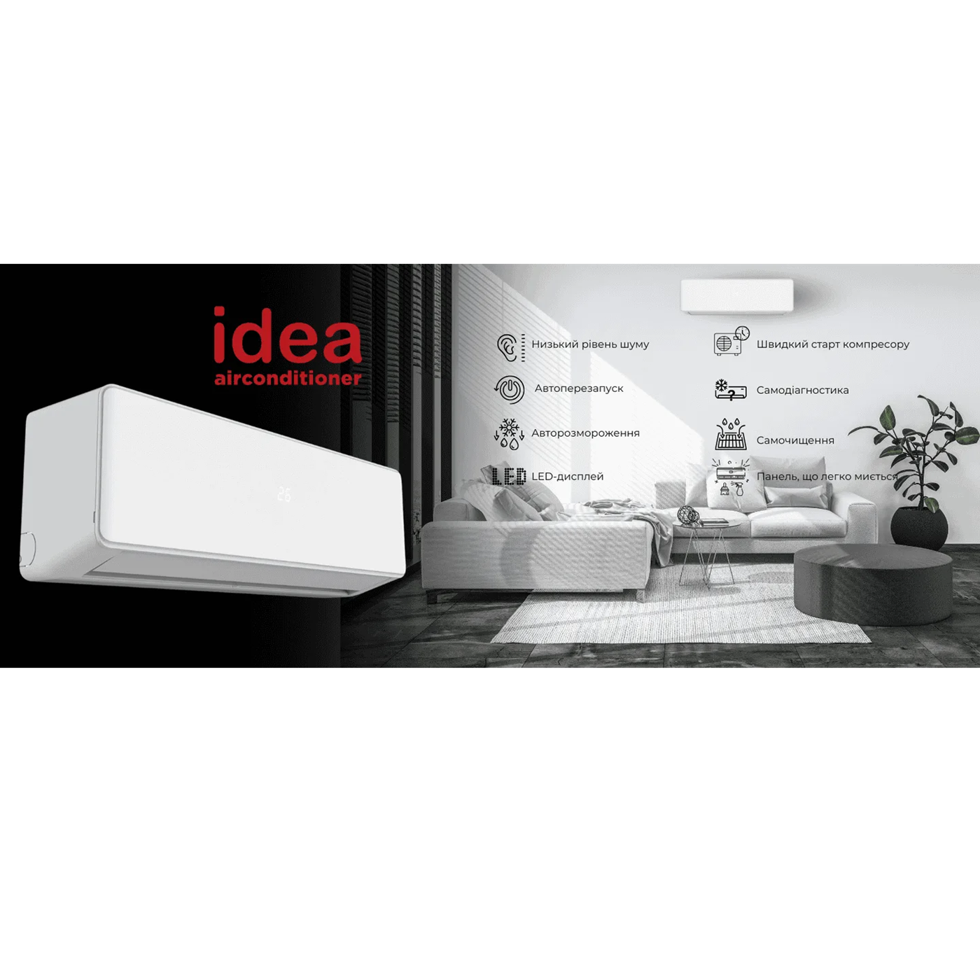 | Функції | Автоматичне розморожування, Нічний режим, Самодіагностика, Турбо режим, 3-хвилинна функція захисту, HD-фільтр, LED дисплей, Автоматичне керування жалюзі (у горизонтальній площині), Автоматичний перезапуск, Антикорозійне покриття теплообмінника, Безшумний режим, Функція Anti-Cold Air |