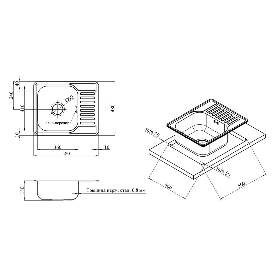 Кухонна мийка Kroner KRP Dekor 580×480 врізна, прямокутна, сталь (0,8 мм)