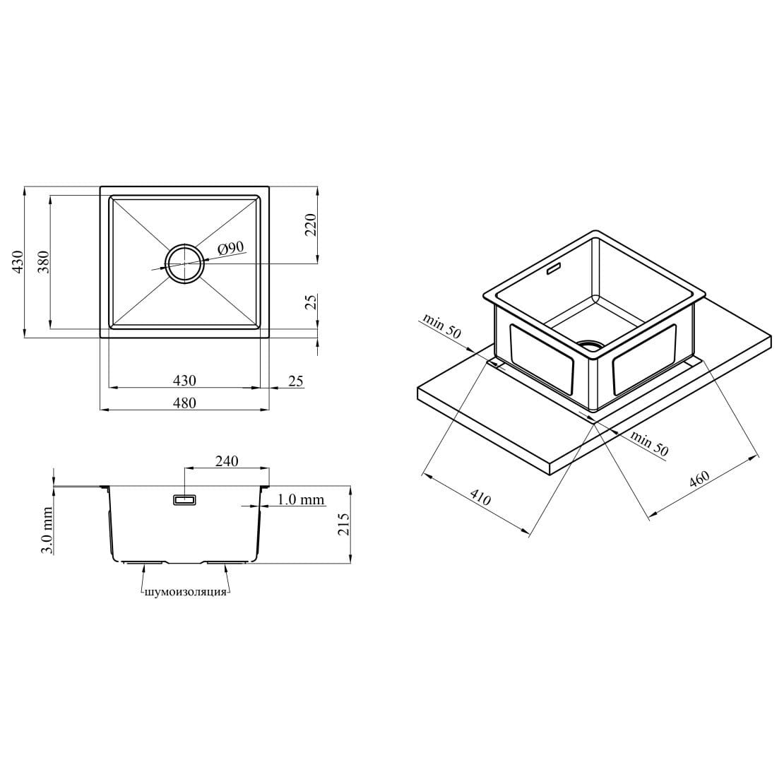 Кухонна мийка Kroner KRP Gebürstet 480×430 інтегрована, прямокутна, сталь (3,0/1,0 мм)