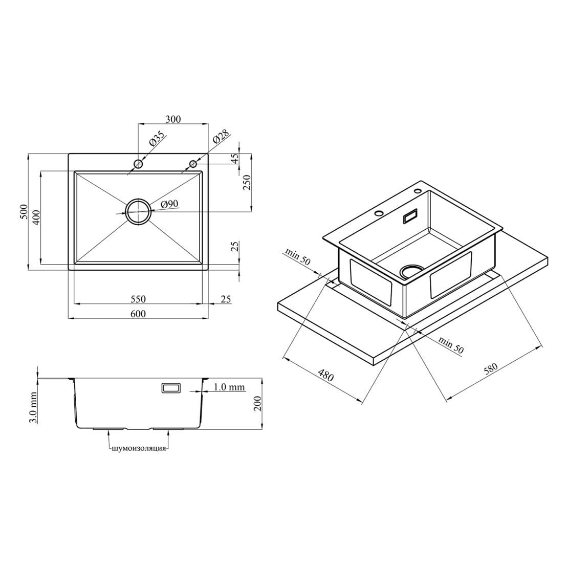Кухонна мийка Kroner KRP Gebürstet 600×500 інтегрована, прямокутна, сталь (3,0/1,0 мм)