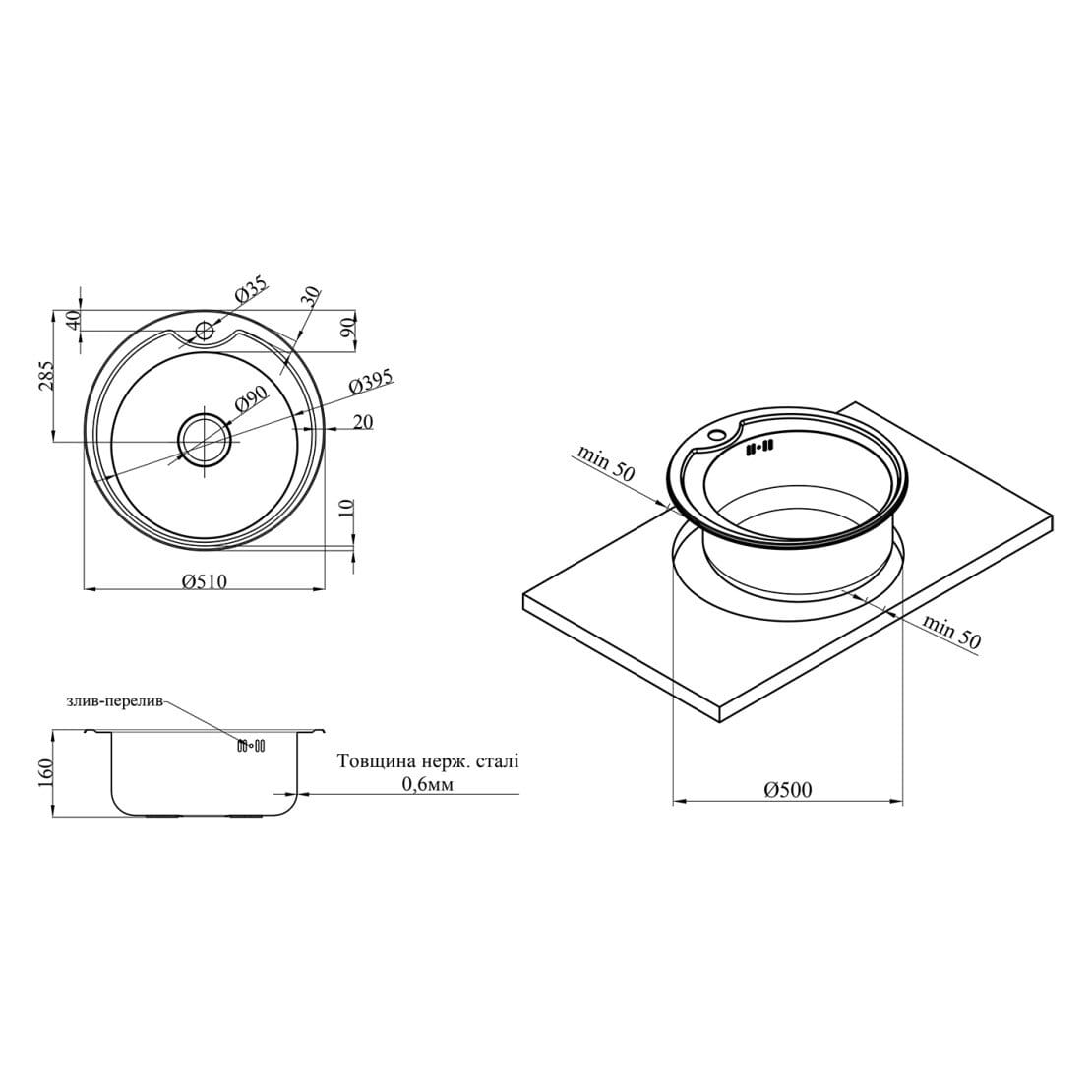 Кухонна мийка Kroner KRP Satin 510×510 врізна, кругла, сталь (0,6 мм)