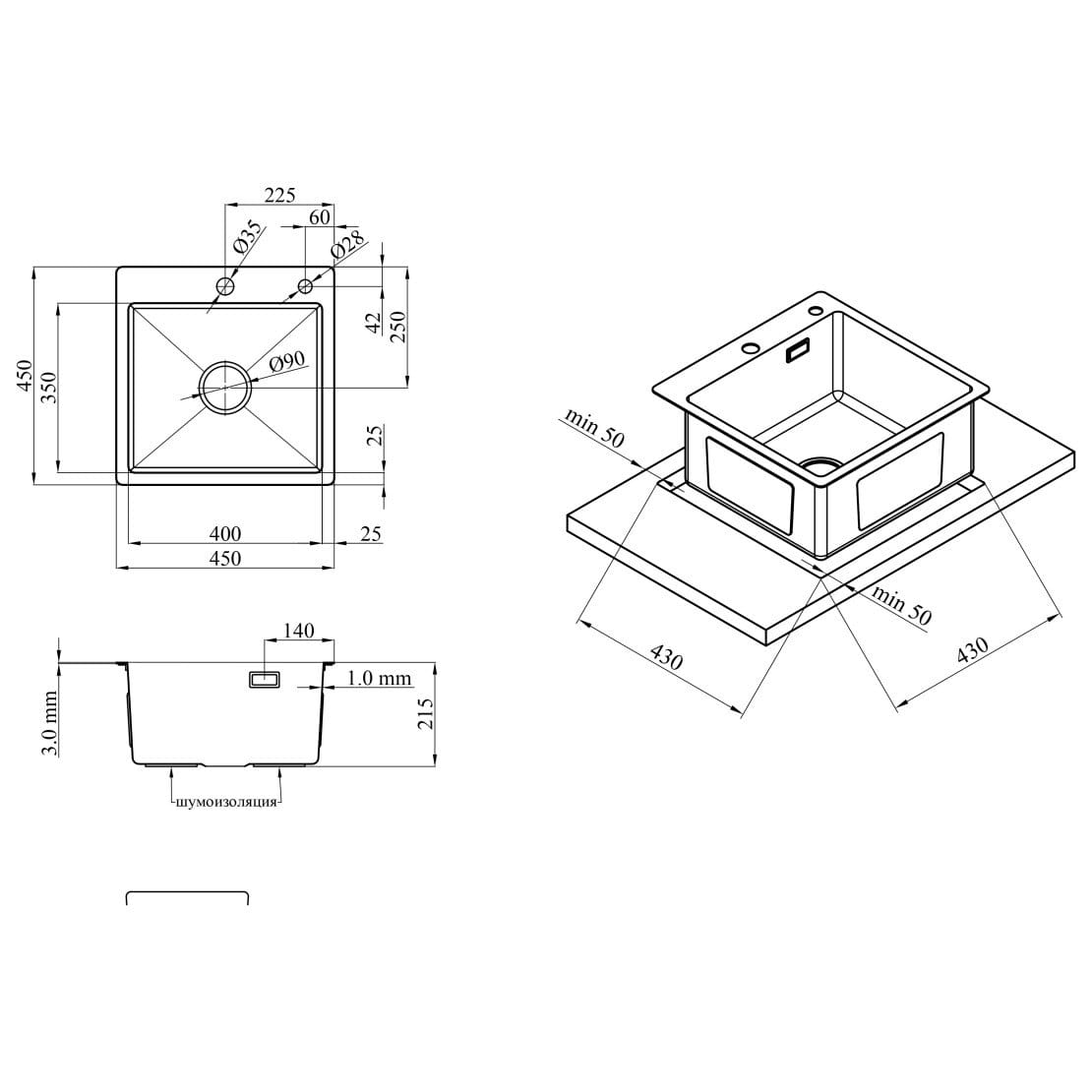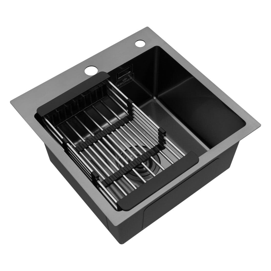 Кухонна мийка Kroner KRP Schwarze 450×450 інтегрована, прямокутна, графіт (3,0/1,0)