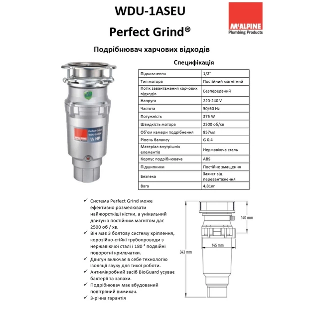 Подрібнювач харчових відходів McAlpine Perfect Grind під мийку, ABS-пластик (WDU-1ASEU)