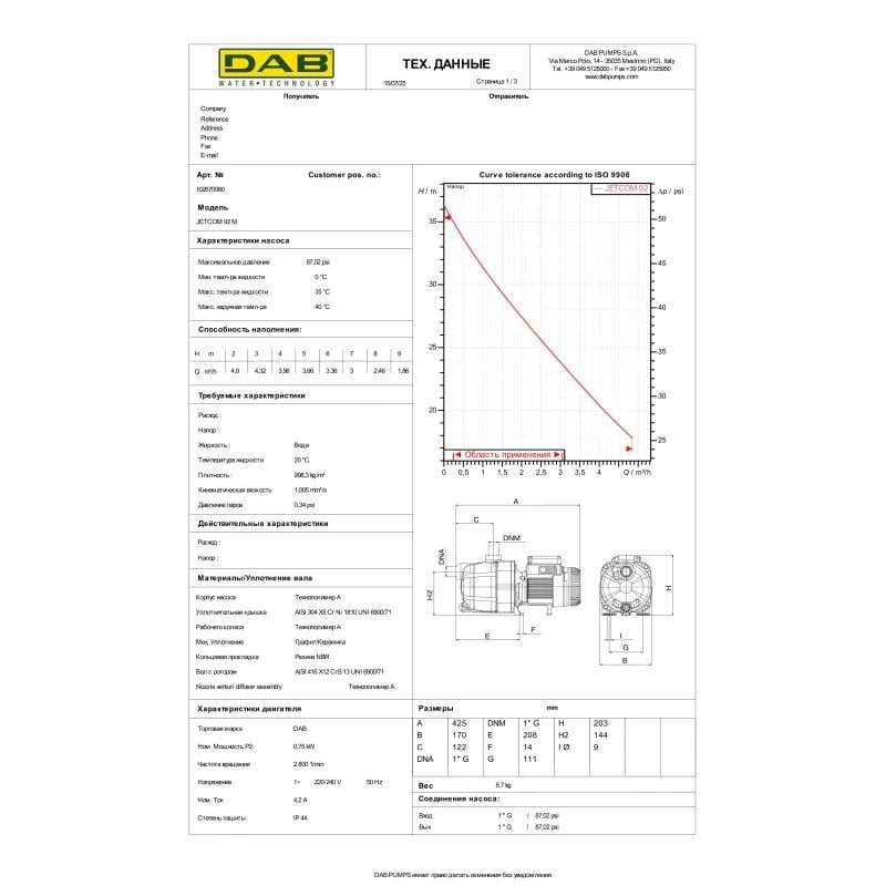 | Потужність насоса, кВт | 0,75 |