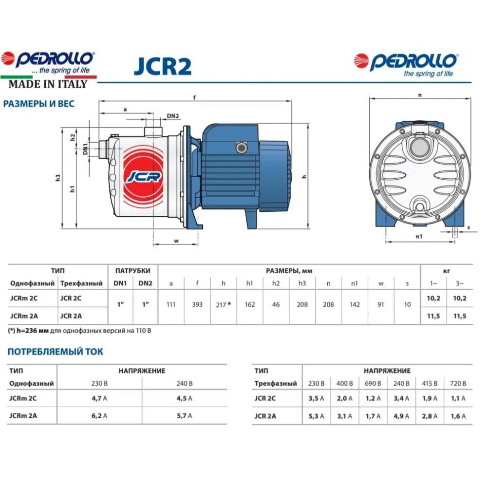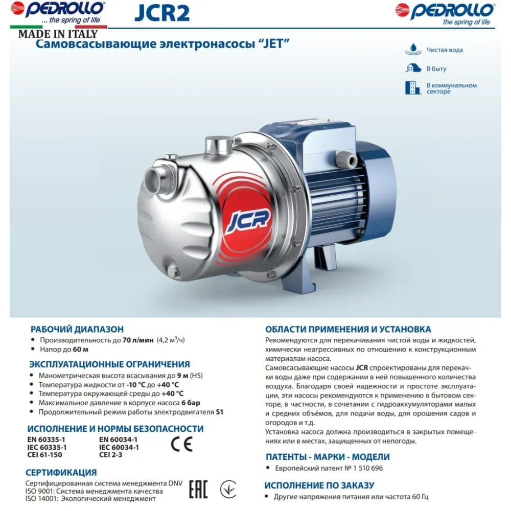 Поверхневий насос Pedrollo JCRm 2C 750 Вт H 47 м Q 70 л/хв відцентровий (46JCR2A10A1)