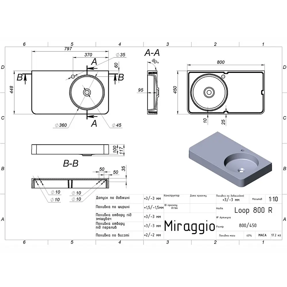 | Длина умывальника, мм | 800 |