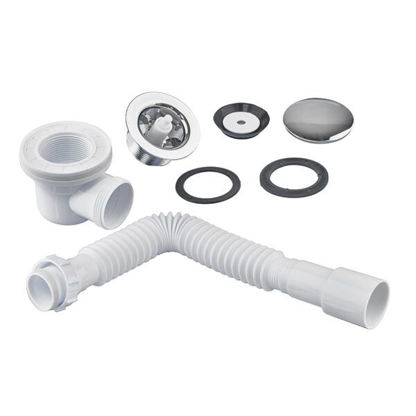 Комплектація | Сифон, Гнучка труба 40х40/50 для підключення до каналізації, Сітка випуску, Пробка |