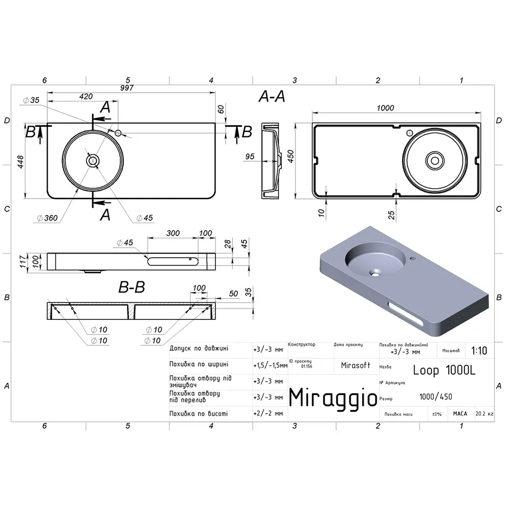 | Длина умывальника, мм | 1000 |