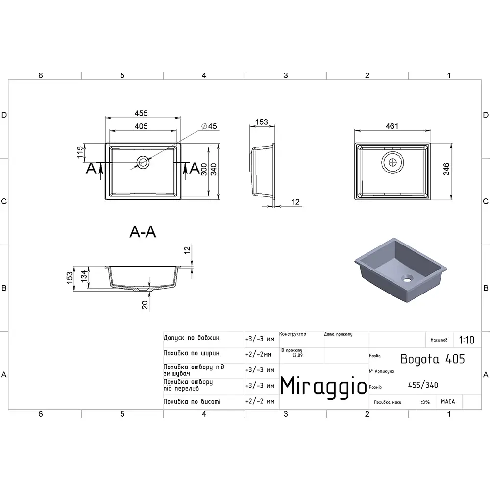Умивальник врізний Miraggio Bogota 455×340 прямокутний, білий